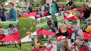 Lastly, we tried to squeeze out of the kids something they are thankful for and write it down on little leaf cut-outs and hang them on the adorable 'Thankful Trees' Alison made. Elijah (2) just kept telling me he was thankful for food (because we say thanks and pray when we eat food I'm guessing?) and Nehemiah (3) could only think of stuff that was right in front of him. He would say he was thankful for whoever was walking by and he kept insisting that he was thankful for the table (the park table)...I'm like that's so cool we get to go to a park and play with our friends and sit at this table...that's great to be thankful for, but what about maybe the table at our house and be thankful you have a house or daddy...he's like--no! I am just thankful for this table! haha. ok. At the end we did duck-duck-goose and Alison brought this apple peeler that will take off the peel of an apple and turn it into a slinky apple as you turn the crank. And that was it---the moment when we had all the kids attention. :)